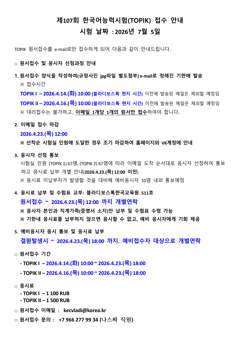 제107회 한국어능력시험(TOPIK) 접수 안내